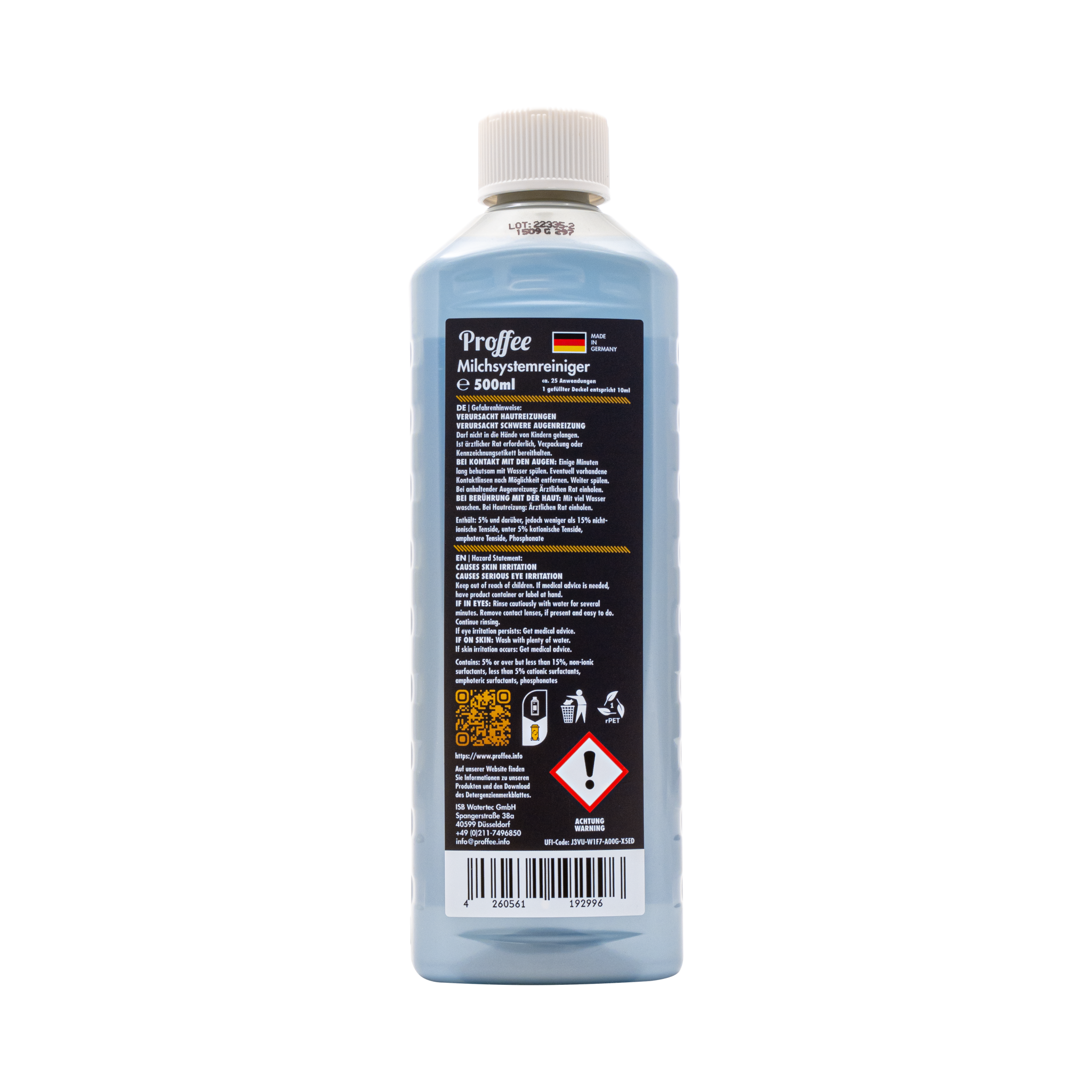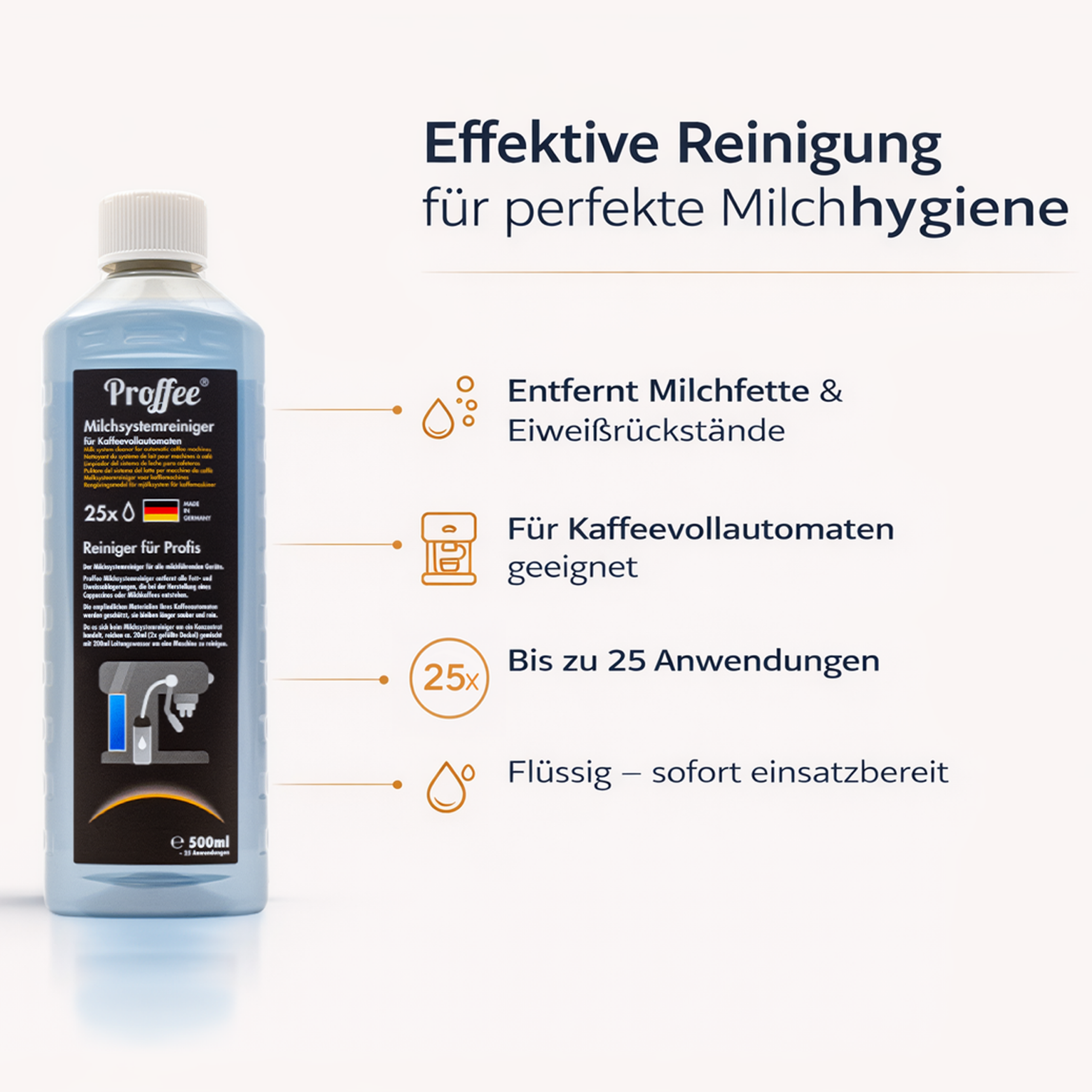 Der Proffee Milchsystemreiniger entfernt zuverlässig Milchfett, Eiweißablagerungen und Bakterien aus Milchsystemen von Kaffeevollautomaten und Milchaufschäumern.